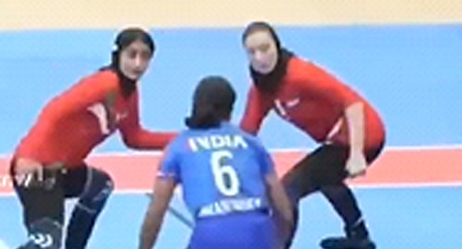 கபடி அணியின் துணைத் தலைவரான கார்த்திகா, பஹ்ரைனில் ஈரானுக்கு எதிரான போட்டியில் வெற்றி பெற்றதற்காகக் கொண்டாடப்படுகிறார்.